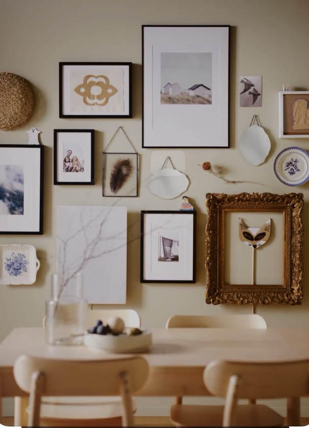 💡 Budget-friendly tip: mix IKEA, Kmart, or thrifted frames with personal items like postcards, kids’ art, or fabric swatches.